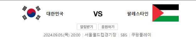 9월 5일 한국과 팔레스타인과의 경기는 두 채널에서 중계방송 시청이 가능합니다.